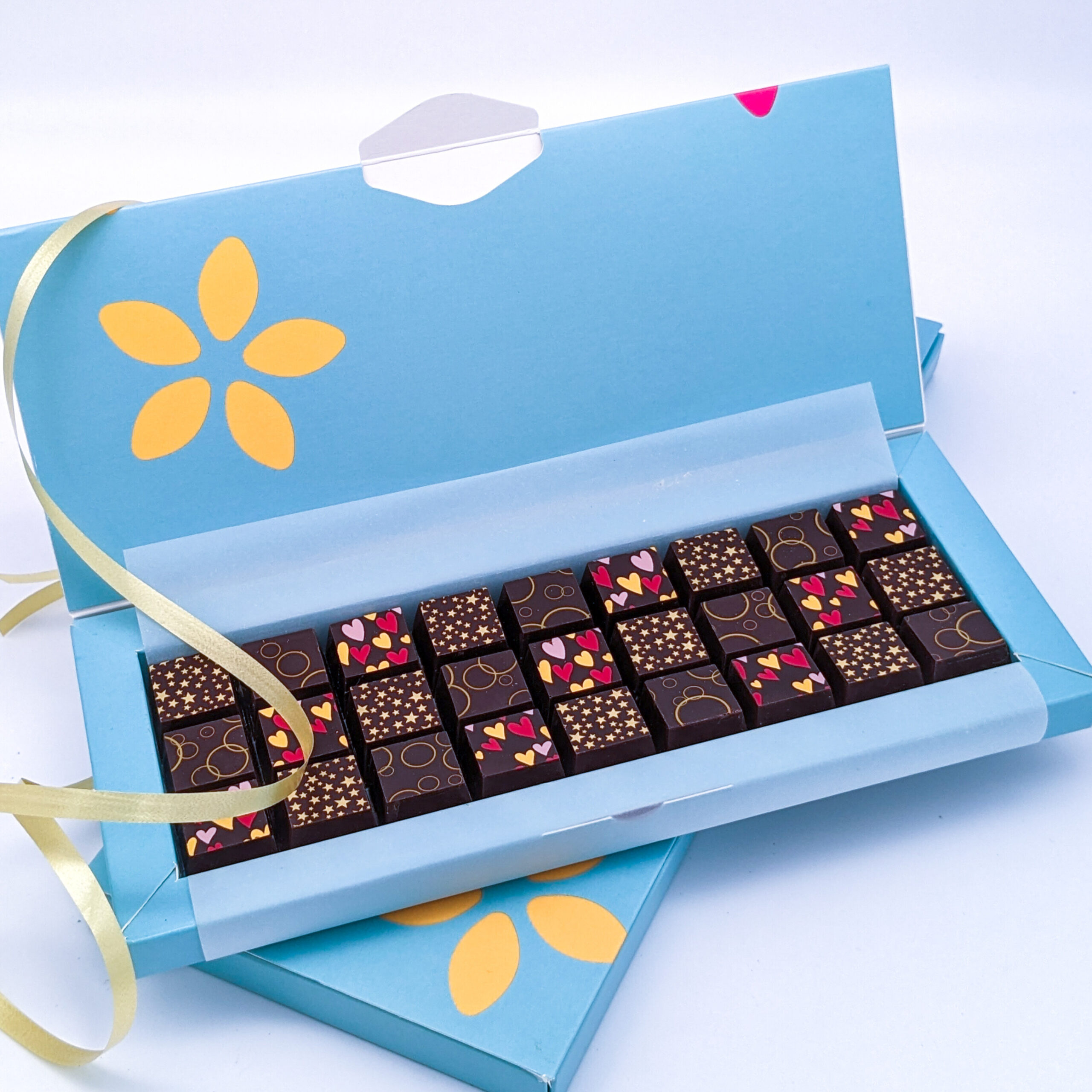 The box is 25.5 x 10.5cm and weighs net 250g, containing 27 chocolates.