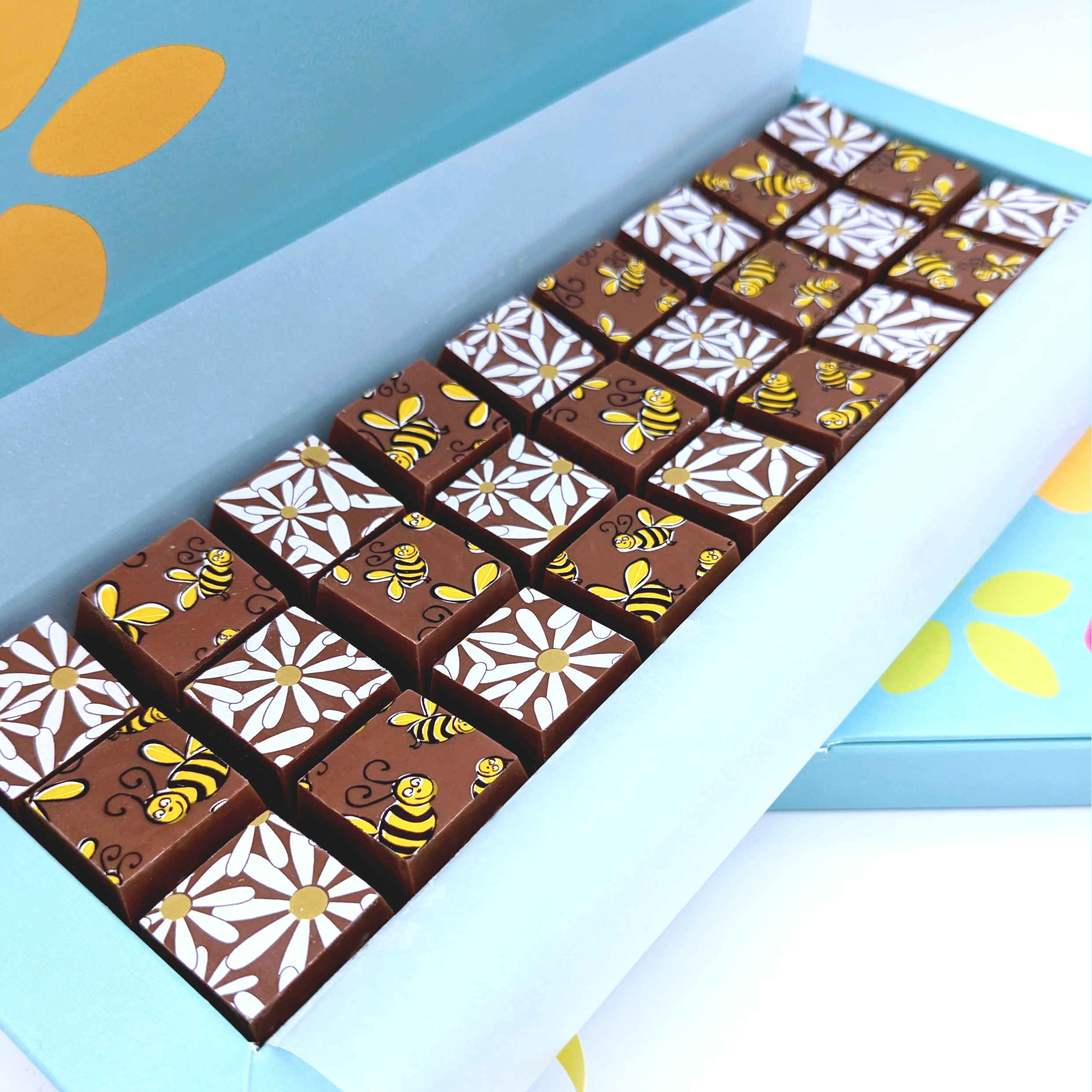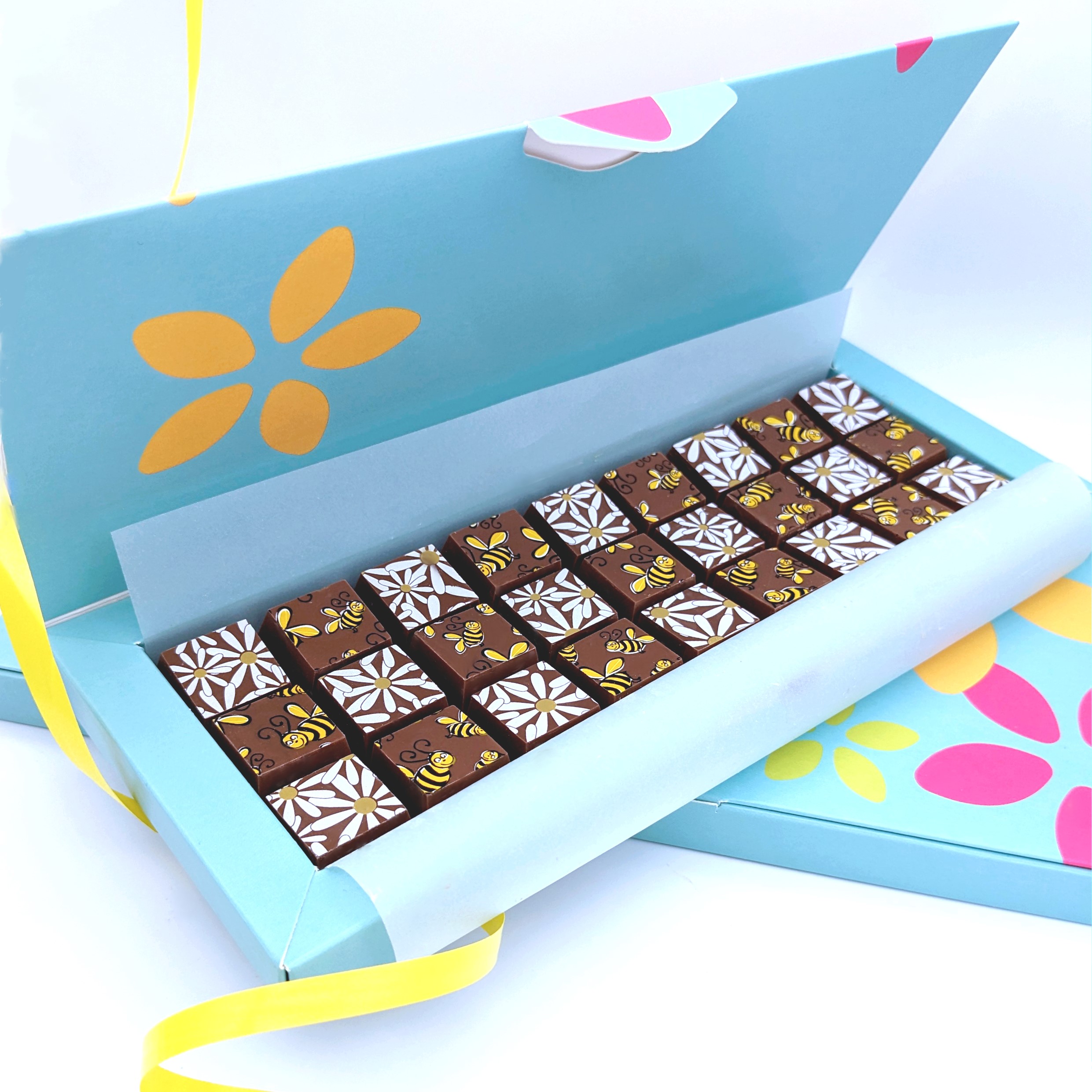 A box of mosaic chocolate blocks using bees and a daisy pattern on milk couverture chocolates. Handmade, delicious and pretty chocolates for beautiful gifts.