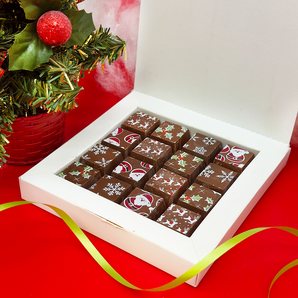 A delicious box of Christmas mosaic chocolates with 16 Belgian milk chocolates with a variety of seasonal patterns.
