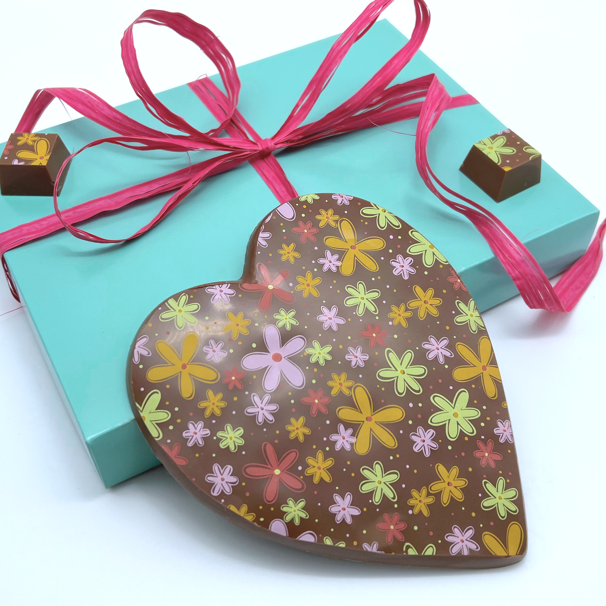 A large chunky milk chocolate heart with a floral pattern. The perfect gift for birthdays, anniversaries, or Valentine’s Day for any dark chocolate lover.