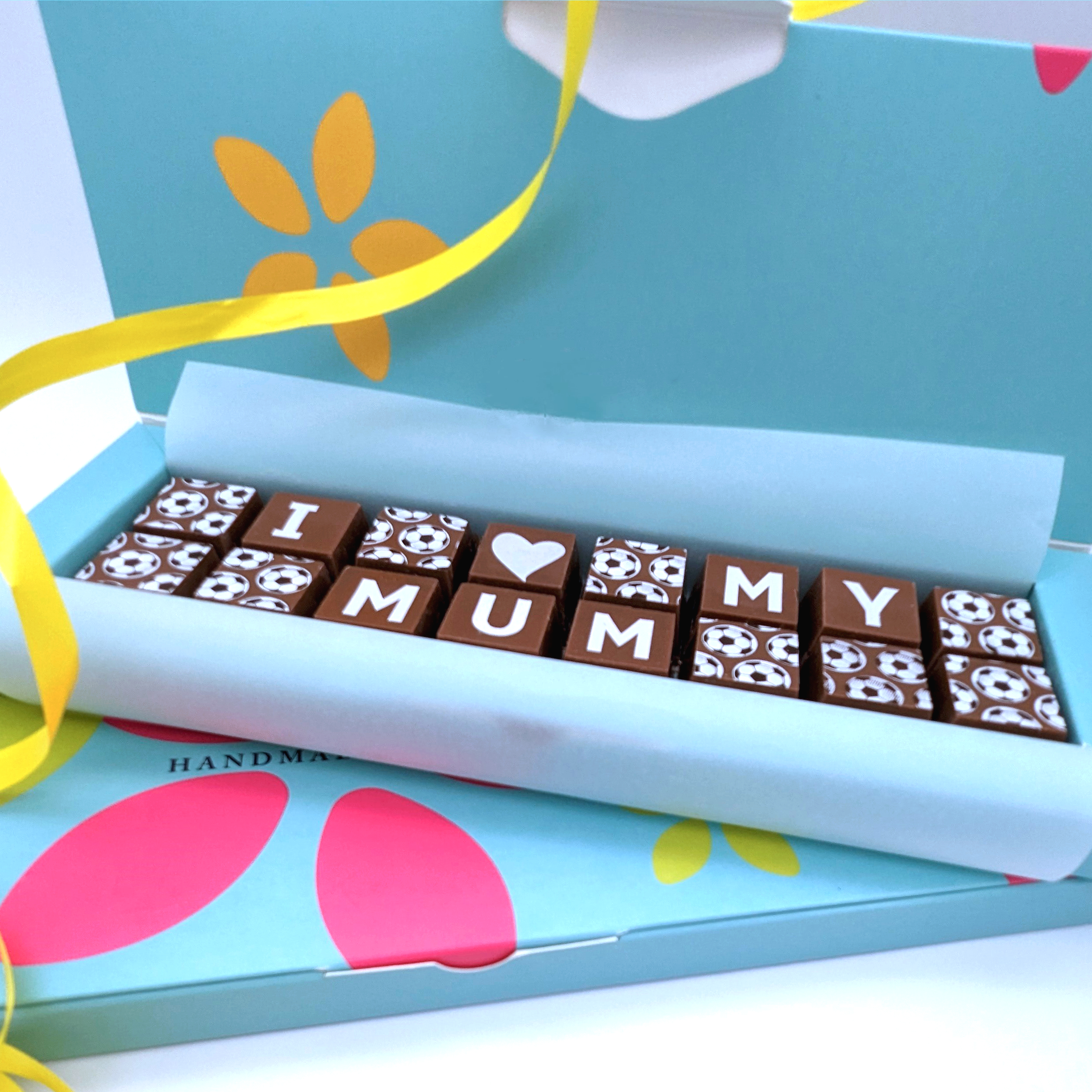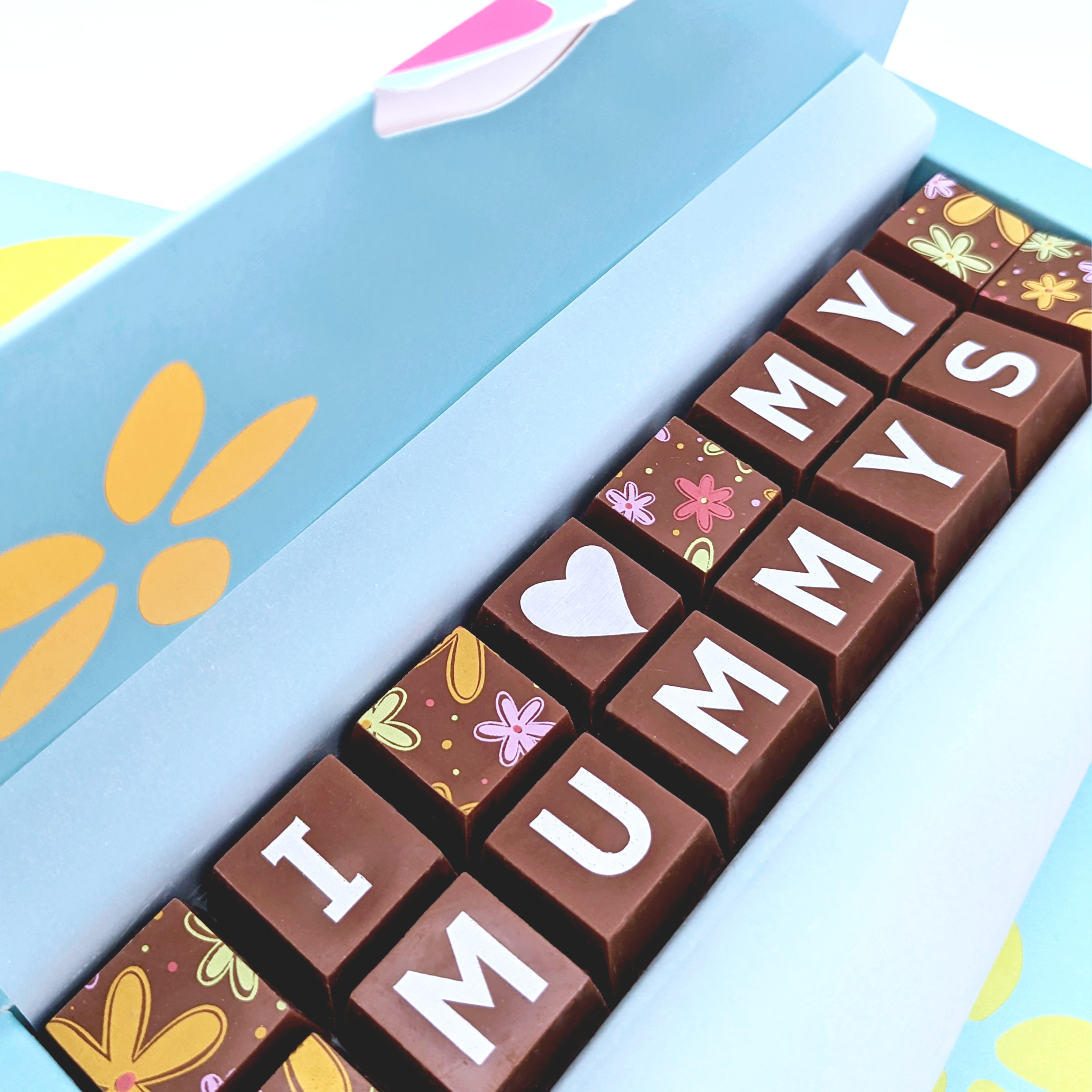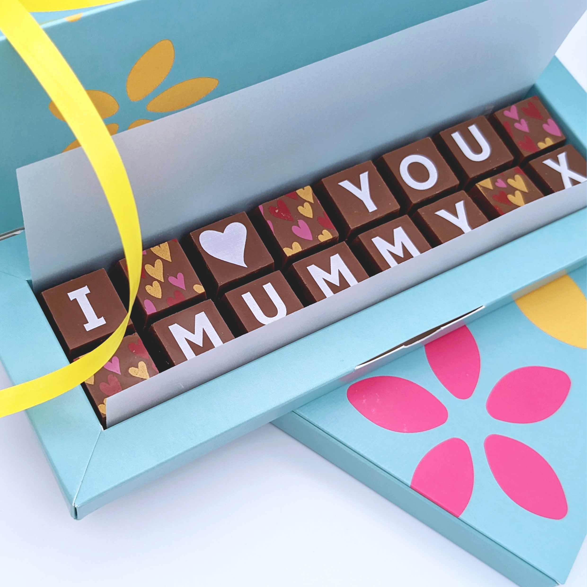 A cute I Love My Mummy box of solid chocolates with a choice of chocolate type and patterns!