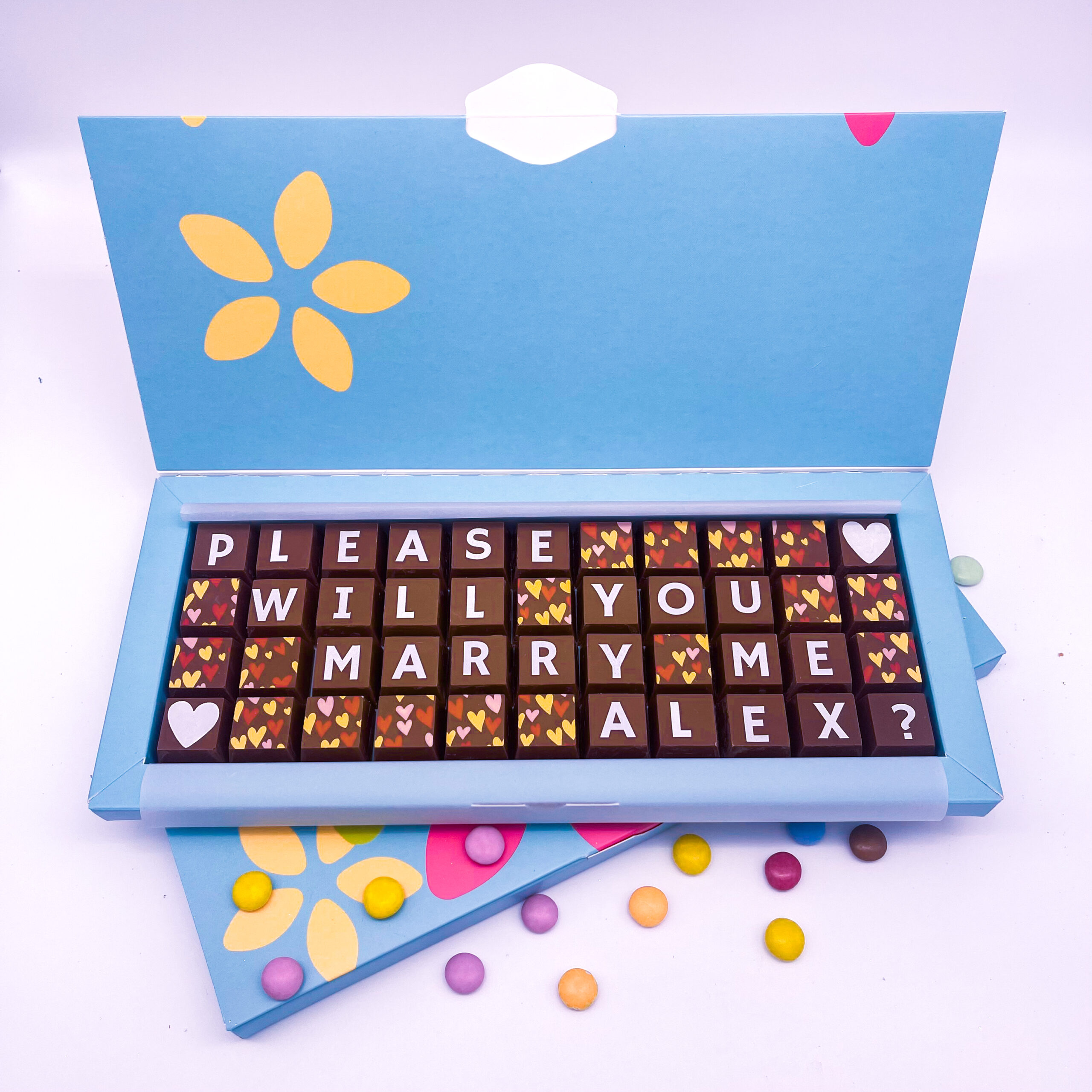 Create your own please will you marry me? message in solid blocks of delicious chocolate. The perfect personalised gift for asking that very special question!