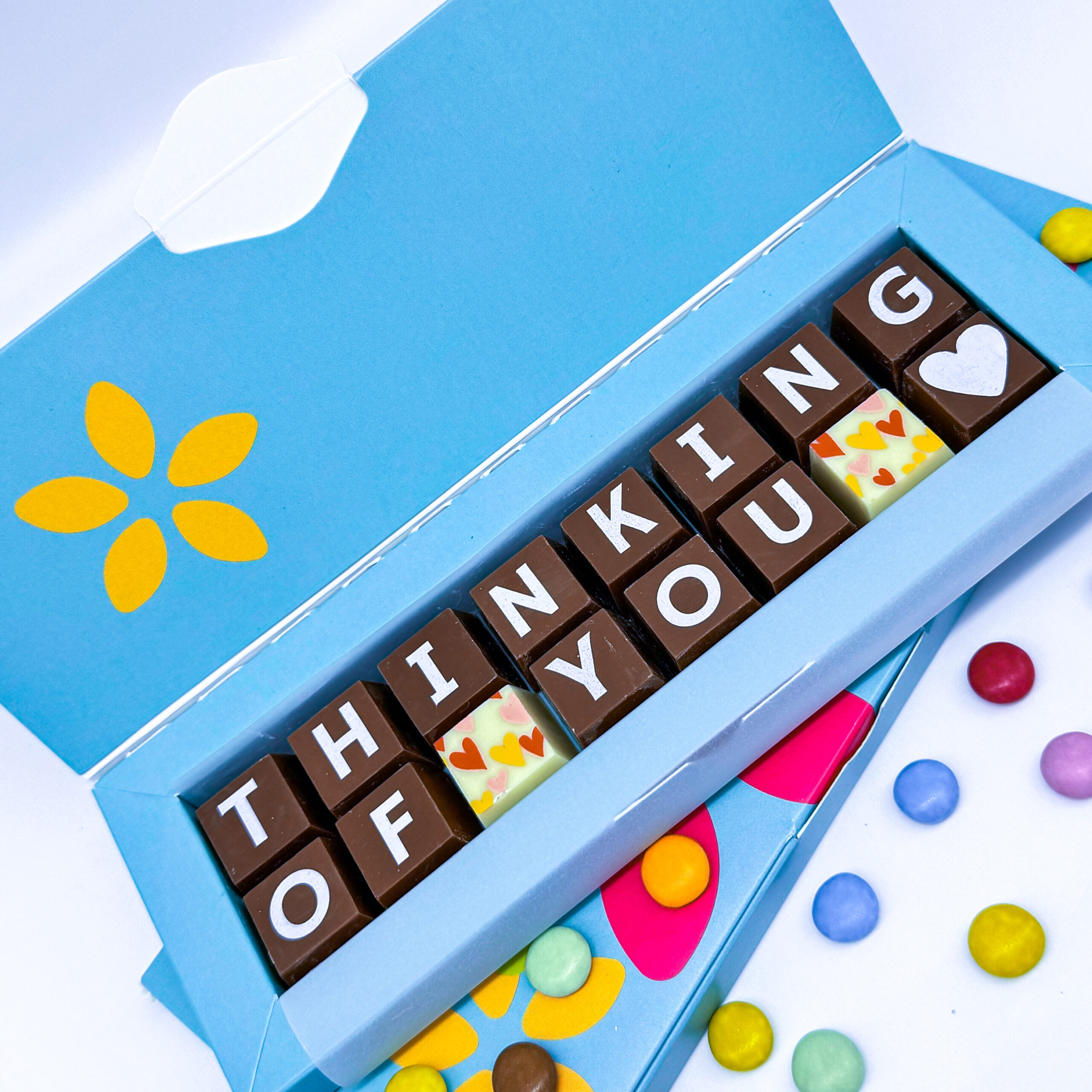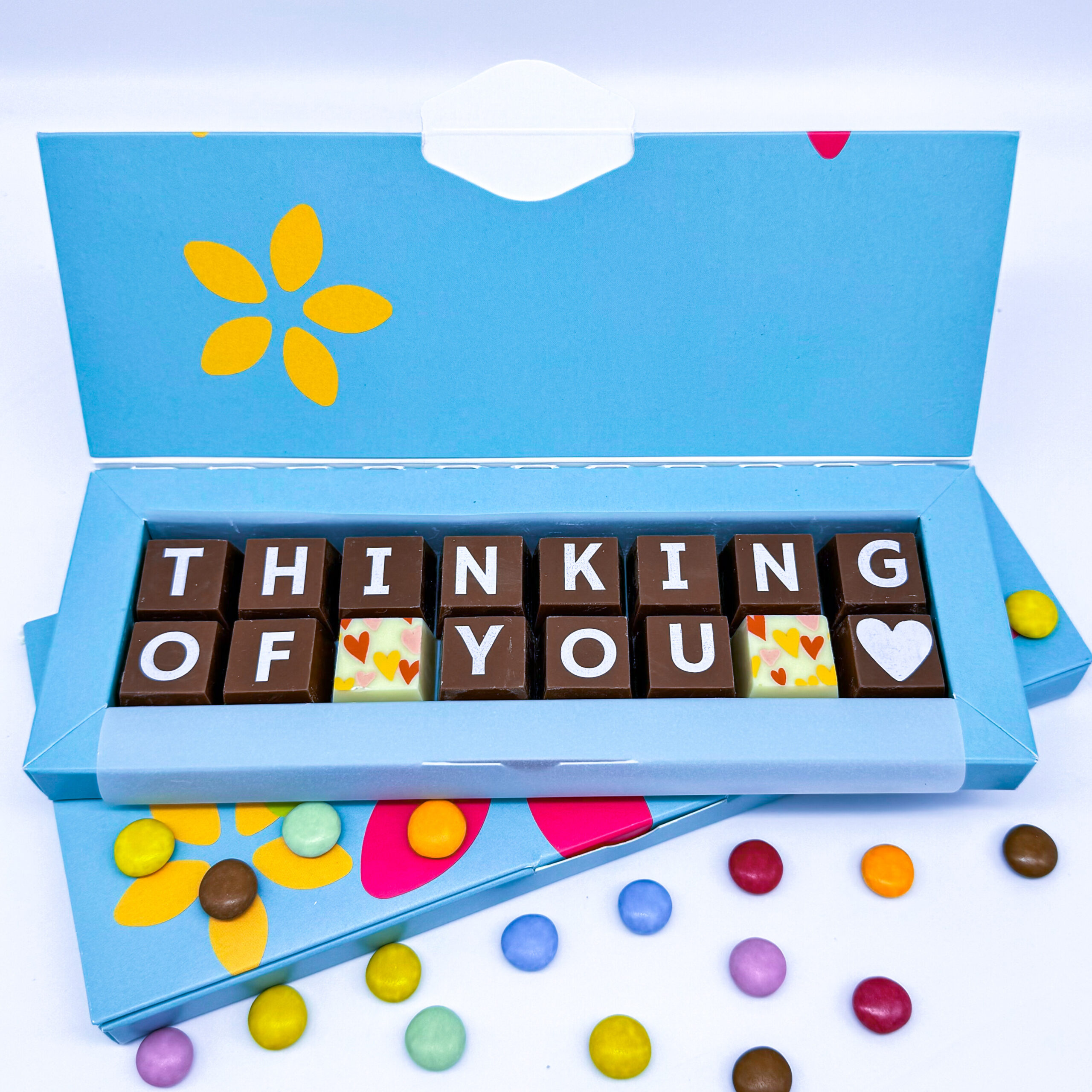 These Thinking Of You Chocolates are a thoughtful gift for anyone who might need to know you’re there for them. Friends, family, colleagues or loved ones will appreciate this supportive message, spelled out in solid Belgian chocolate.